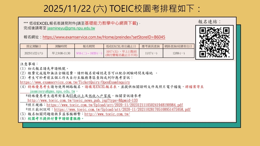 2. 2025/11/22 (六) TOEIC校園考排程如下:
